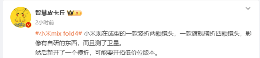 另一款已测试成型的手机是旗舰横折手机,其搭载后置四摄,且手机影像都有“自研的东西”,测试了卫星通信。该博主还透露,小米还新开了一款横向折叠屏手机,据称该折叠屏手机可能要开拓低价位版本。