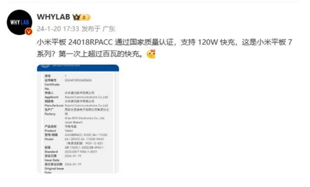 根据爆料,新款平板可能是小米平板7系列,新平板首次支持超100W的快充。