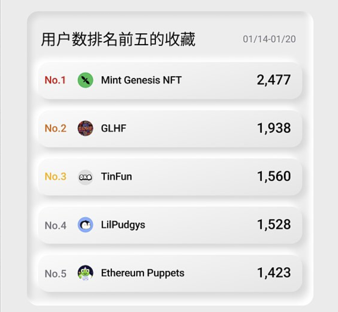 4、上周用户数排名前五的收藏:Mint Genesis NFT、GLHF、Tin Fun、LilPudgys、Ethereum Puppets