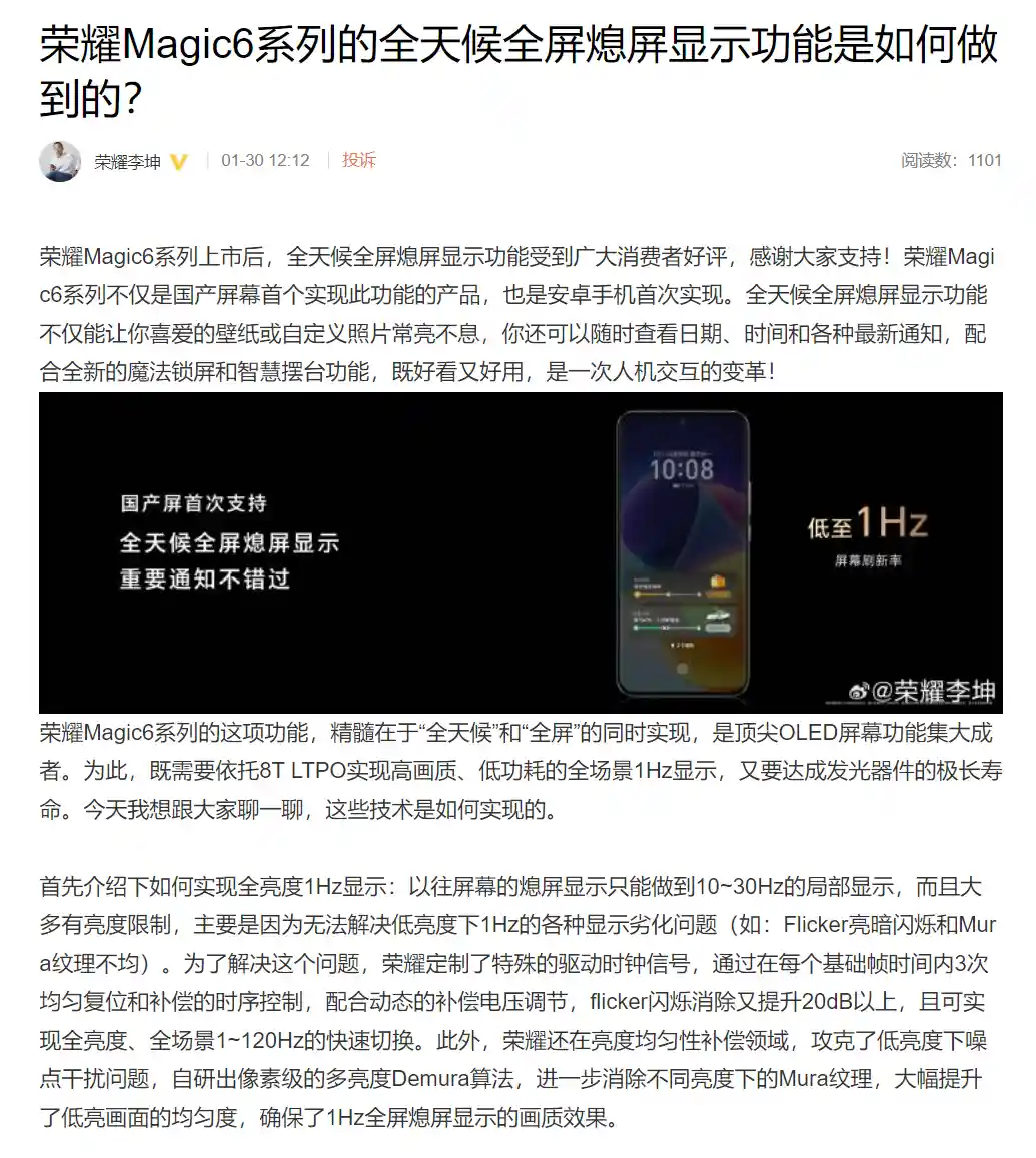 1月30日,荣耀高管李坤在微博上发表了一篇文章,深入地解释了荣耀Magic6系列的全天候全屏熄屏显示功能的技术原理和优势。之前我们了解到,荣耀Magic6系列的一大创新亮点是全域全场景低功耗LTPO显示技术的应用,实现了全域低功耗与全局流畅兼得。