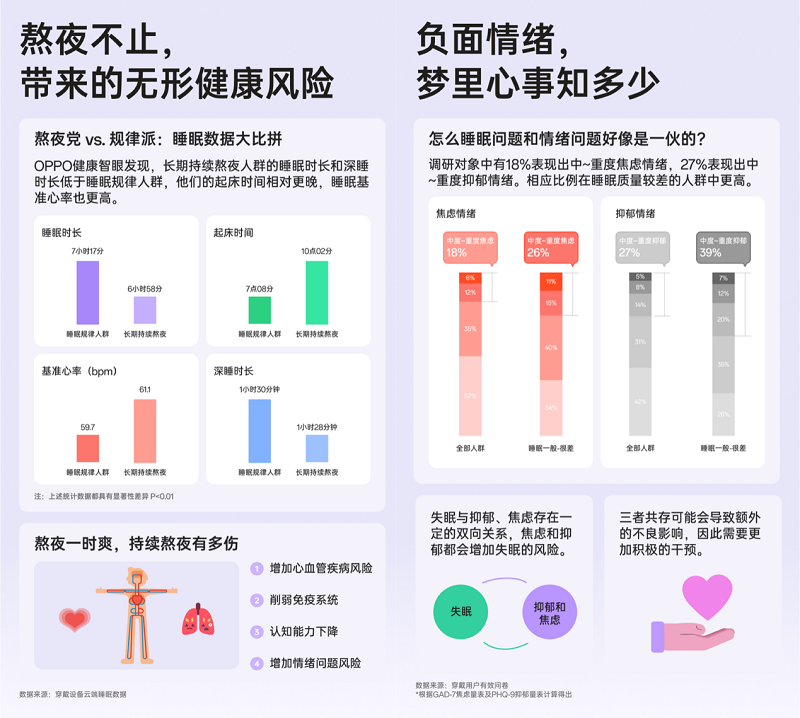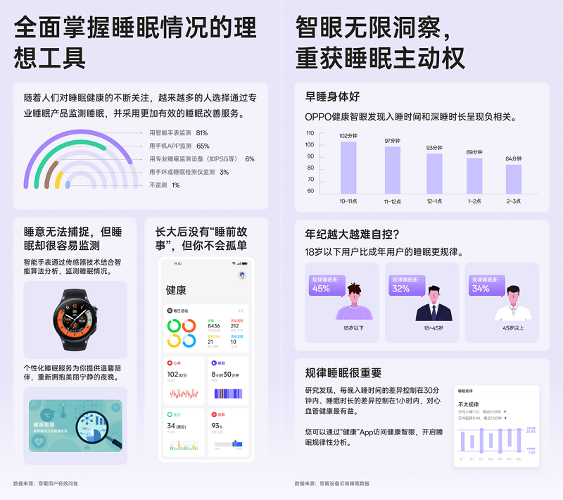 睡眠健康是 OPPO 健康实验室关注的重点方向之一,2021 年初,OPPO 正式成立健康实验室后就开始推动心率、心电、鼾症检测等健康相关算法自研,通过构建以健康算法、传感器、数据科学、生物医学为核心的底层创新技术,为广大 OPPO 用户睡眠健康等领域提供丰富和长久的健康服务。在算法及服务上,健康实验室全新自研的OPPO Sense® Sleep 睡眠健康技术体系已全面应用于OPPO设备中,并实现软硬件联动。在智能硬件上,目前 OPPO 智能穿戴设备,已经实现全面的睡眠监测功能,包含每秒级的实时睡眠血氧监测,睡眠心率分析,深睡、浅睡、清醒等睡眠状态监测。