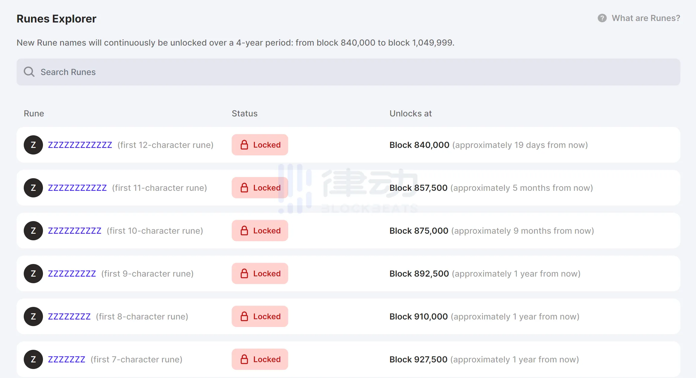 第一个被正式解锁的「符文」ticker 为什么会是「ZZZZZZZZZZZZ」?「符文」ticker 的最大长度是 26 字符(Casey 硬编码的「UNCOMMON•GOODS」和此规则无关,另外值得注意的是「•」作为分隔符不算在 12 字符内,这是为了让 ticker 更有辨识度,比如「WO•YAO•DISS•YOU」),但是它是一个随时间(区块)反向解锁的过程,从长 ticker 逐渐解锁到短 ticker。简单来说,在区块高度 840,000「符文」正式激活后,所有 13 – 26 字符的 ticker 都可以立即被部署,但「ZZZZZZZZZZZZ」是第一个可以被部署的 12 字符 ticker。12 字符的 ticker 将在区块 840,000 – 857,500 被全部解锁,也就是每 17,500 个区块后,更短 1 个字符的 ticker 将开始逐渐被解锁。所以对于熟悉的 4 字符 ticker,比如 $PEPE,我们需要等待大约 3 年的时间。