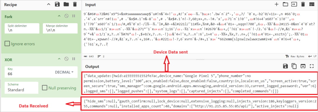 一旦 Anatsa 在新感染的设备上启动并运行,它就会上传机器人配置和应用程序扫描结果,然后下载与受害者位置和个人资料相匹配的注入。