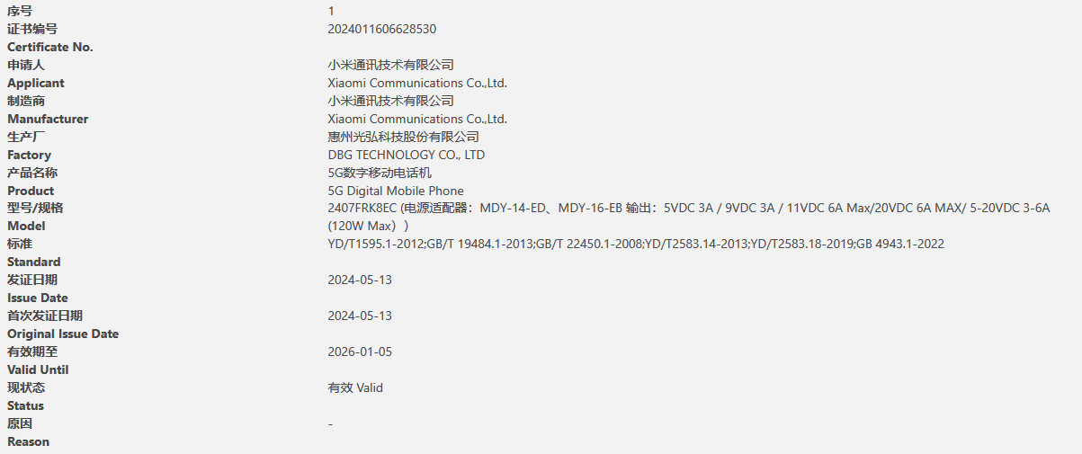 5 月 13 日,小米有一款型号为 2407FRK8EC 的手机新品通过了国家 3C 质量认证入网,结合之前曝光的信息来看就是小米即将发布的 Redmi K70 Ultra。