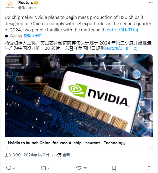 IT之家 1 月 9 日消息,据路透社,英伟达计划于 2024 年第二季度开始量产中国特供的 AI 芯片,以遵守美国出口管制新规,其中最强的型号就是 H20。英伟达对此拒绝置评。