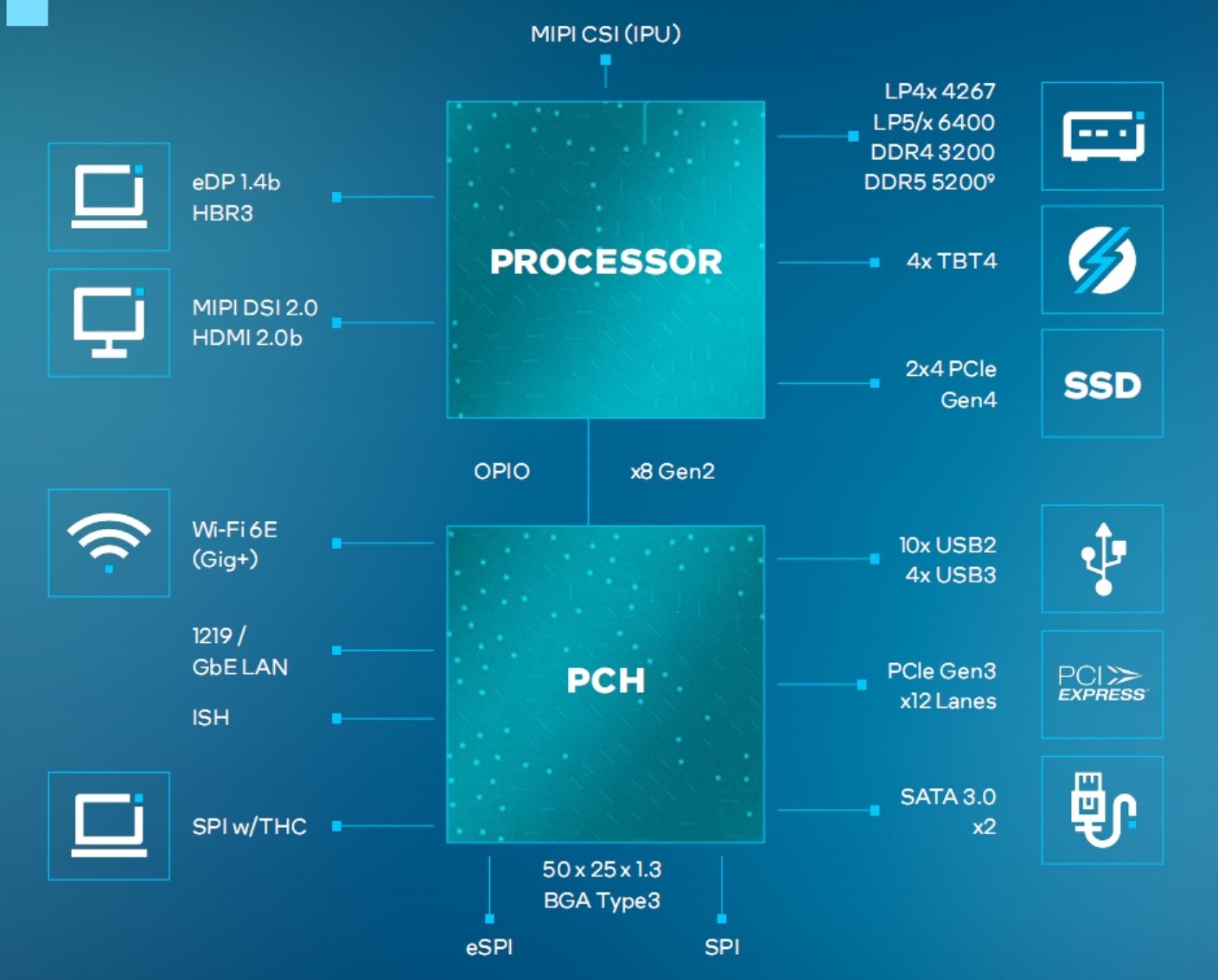 内存支持非常丰富,包括DDR5-5200、DDR4-3200、LPDDR5/5X-6400、LPDDR4-4267,最大容量96GB,扩展可以提供两组PCIe 4.0 x4、四个雷电4,但没有雷电5。