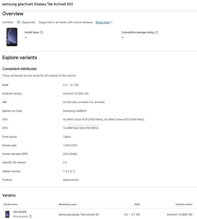 IT之家 1 月 10 日消息,三星 Galaxy Tab Active 5 5G 平板近日现身 Google Play Console,显示型号为 SM-X306B,配备 6GB 内存,运行安卓 14 系统。