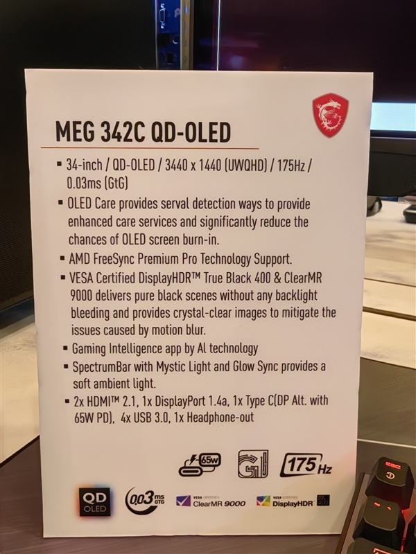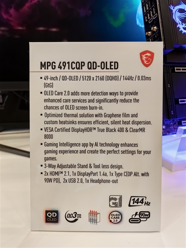 在显示器方面,微星带来了获得CES 2024“游戏&电竞”和“计算机周边&配件”类创新奖的MPG 491CQP QD-OLED,这款显示器拥有49英寸32:9比例,5120 x 1440分辨率及1800R曲率,144Hz刷新率以及0.03ms GTG响应时间。