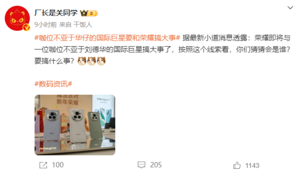 日前,数码博主“厂长是关同学”爆料,荣耀将与一位国际巨星合作,咖位不亚于刘德华。消息一出很快引起网友的热议和猜测,有猜测是成龙、张学友的,也有猜梁朝伟、周润发,甚至是周星驰。