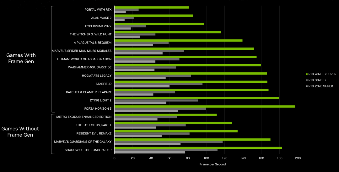 从英伟达给出的显卡定位中可以看到,4070Ti Super 对应的只是 “ 畅玩 2K 下高帧率 ”,想要拉满的分辨率和帧率的体验,还得上更好的卡才行。