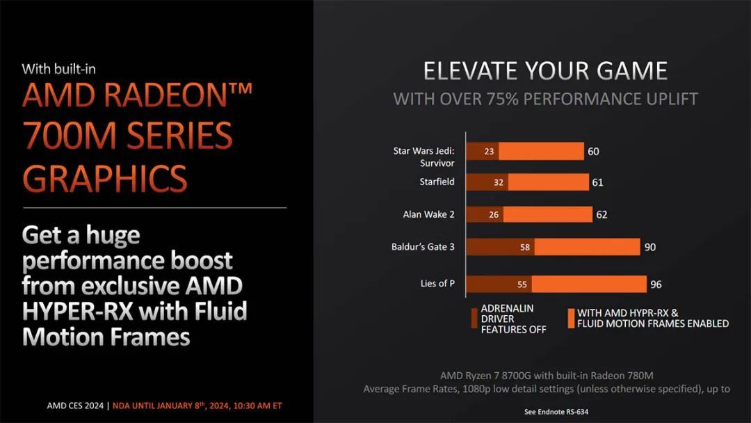 随后,AMD 推出了面向消费端的第一个重磅炸弹——是之前已经预热很长时间的锐龙 8000G 系列高性能 APU。