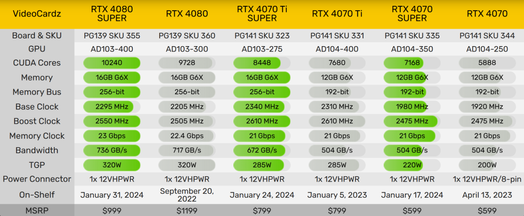 Super 系列整体性能提升不少,在 Cuda 核心数、频率、显存带宽这几块参数上都属于鸟枪换炮,价格也没涨,4080 Super 的发布价格甚至还倒挂 4080。。。