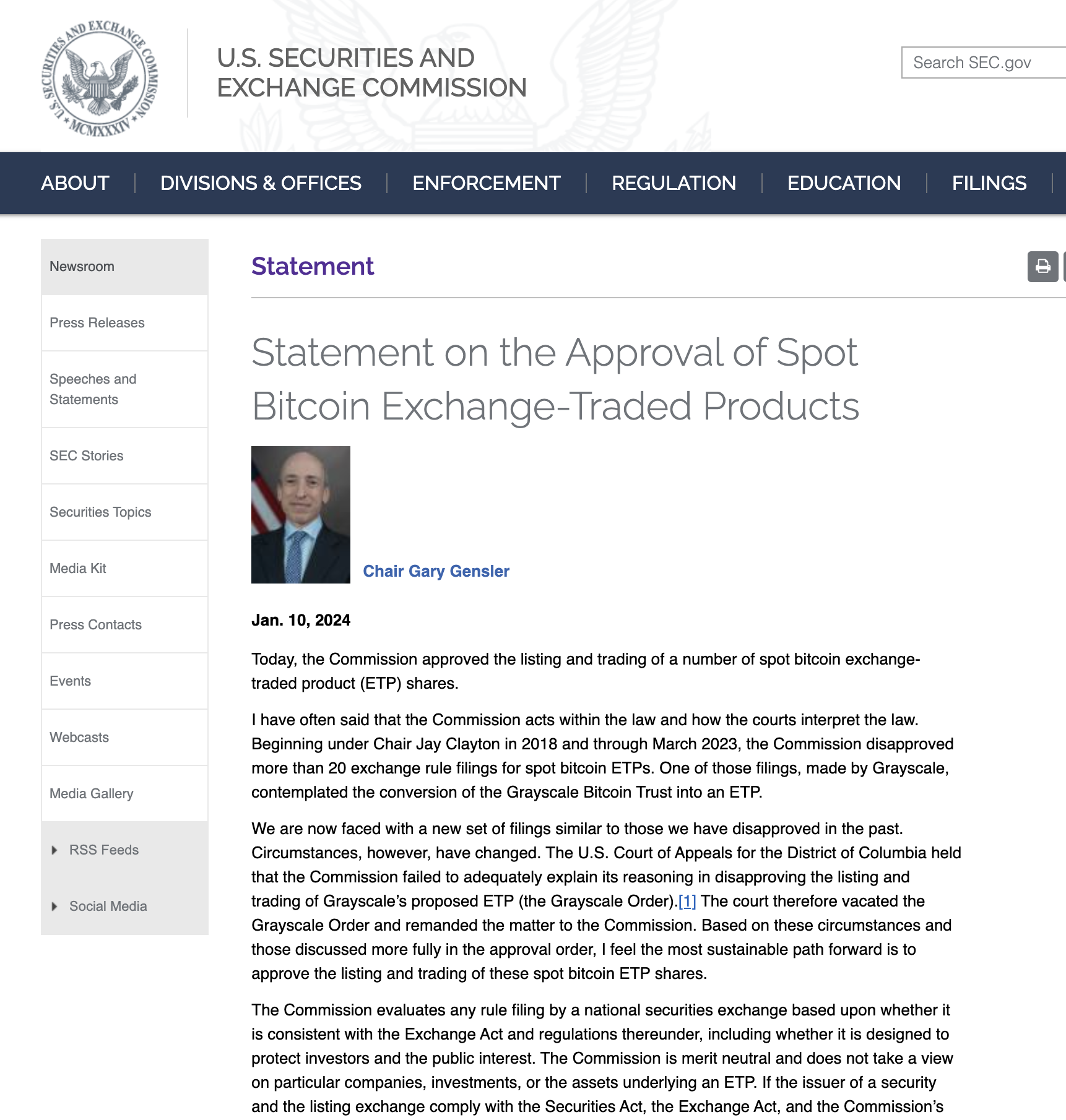 我经常说,委员会是在法律和法院对法律的解释范围内行事。从2018年杰伊·克莱顿主席开始,直到2023年3月,委员会驳回了超过20份关于现货比特币ETP的交易规则申请。其中之一是由Grayscale提出的,计划将Grayscale比特币信托转变为ETP。