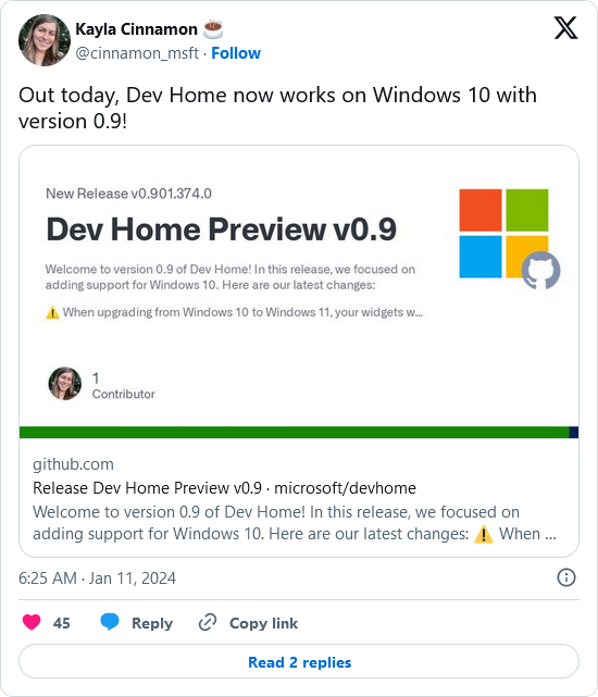 IT之家 1 月 11 日消息,微软今天发布了 Dev Home 0.9 版本更新,重点添加了对 Windows 10 系统的支持。Dev Home 自推出以来,一直是 Windows 11 专属,而微软现在选择下放到 Windows 10 系统上。