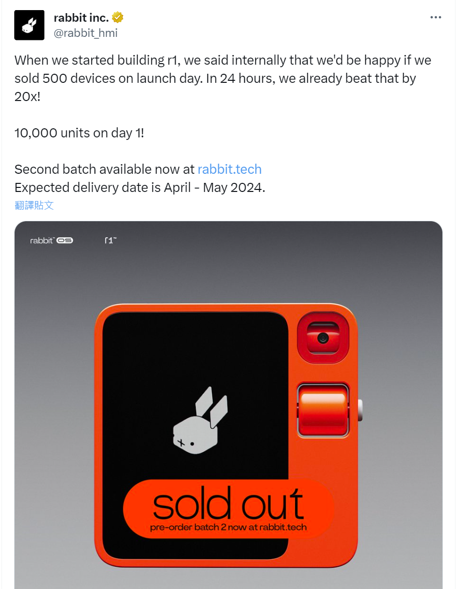 1 月 11 日,初创公司 Rabbit (中文名:兔子,LOGO也是一只兔子)官方在 X(Twitter)上宣布首日就卖出了 1 万台 rabbit r1,比起他们内部设想的 500 台高了整整 20 倍,同时还表示第二批 rabbit r1 订单预计将于 4 月到 5 月交付。