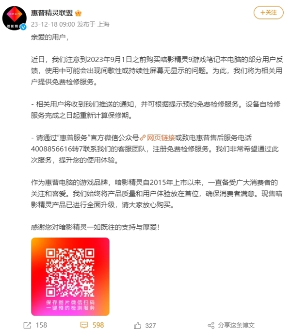 问题爆发后,惠普官方于12月18日宣布为相关用户提供免费检修服务。