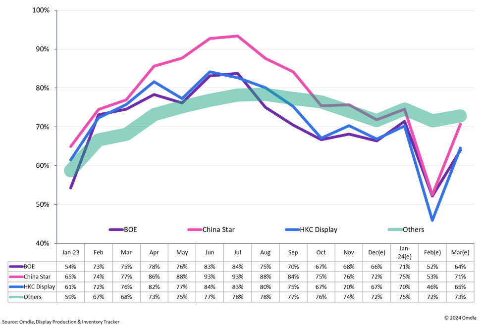 中国三大面板制造商京东方、华星光电、HKC均计划在第一季度削减产能,尤其是在2月份春节假期期间,将停产时间从此前的一周延长至二周。因此,2月份平均产能利用率仅为51%,而其它制造商约为72%。