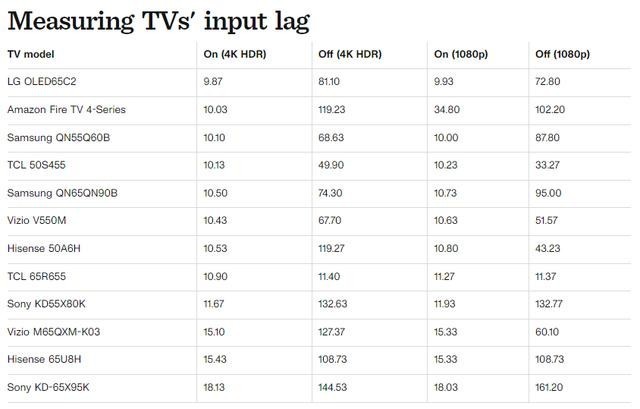 (CNET对12款电视进行输入延迟测试结果)采用OLED自发光技术的电视输入延迟明显低于传统LCD产品