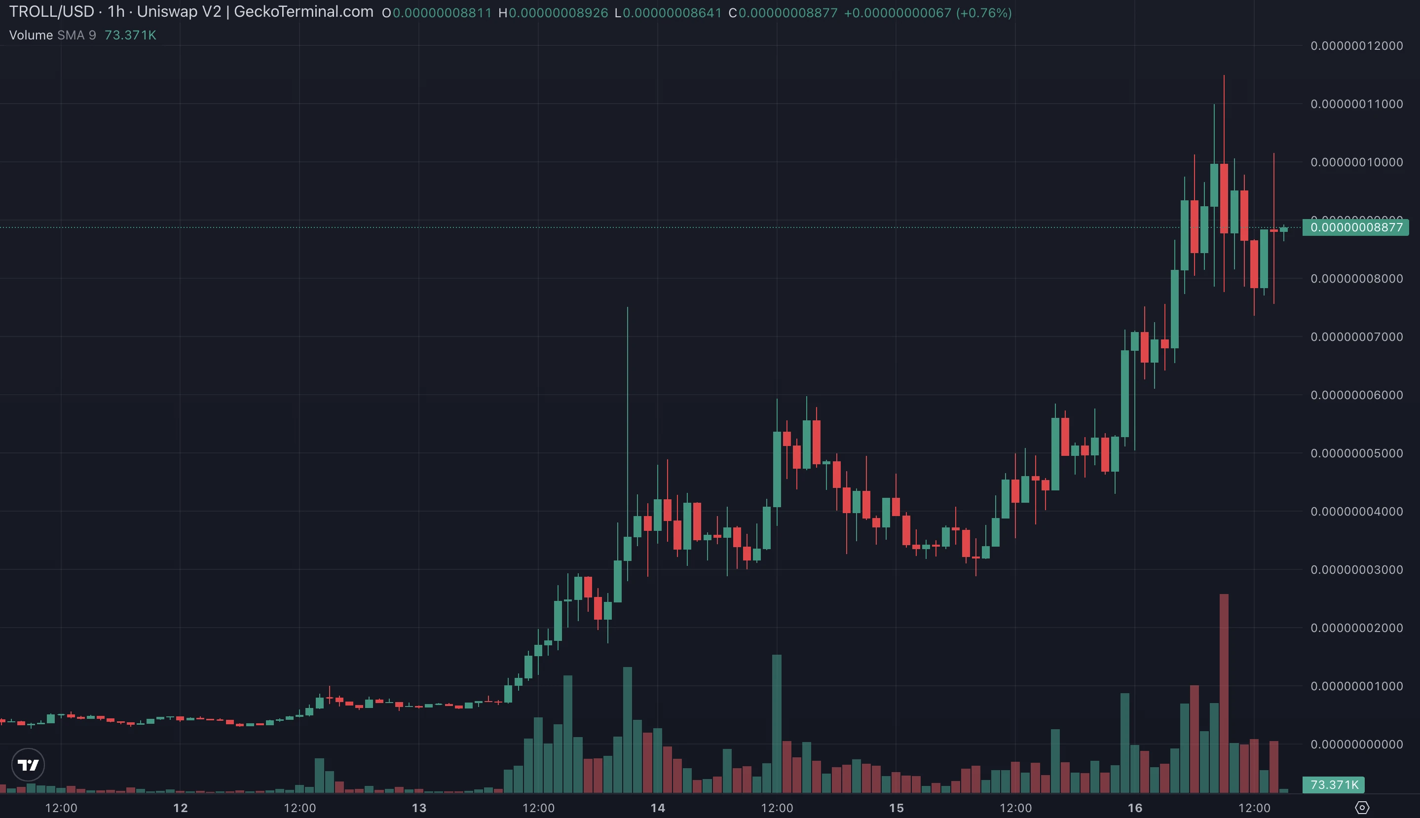 然而,在马斯克走马上任“巨魔官”之后,TROLL的快速上涨引发了FOMO情绪。在上周末,TROLL市值仅约百万美元,但经过一个周末的疯狂涨势,目前TROLL的市值已经达到8500万美元,价格涨幅达到了7倍。