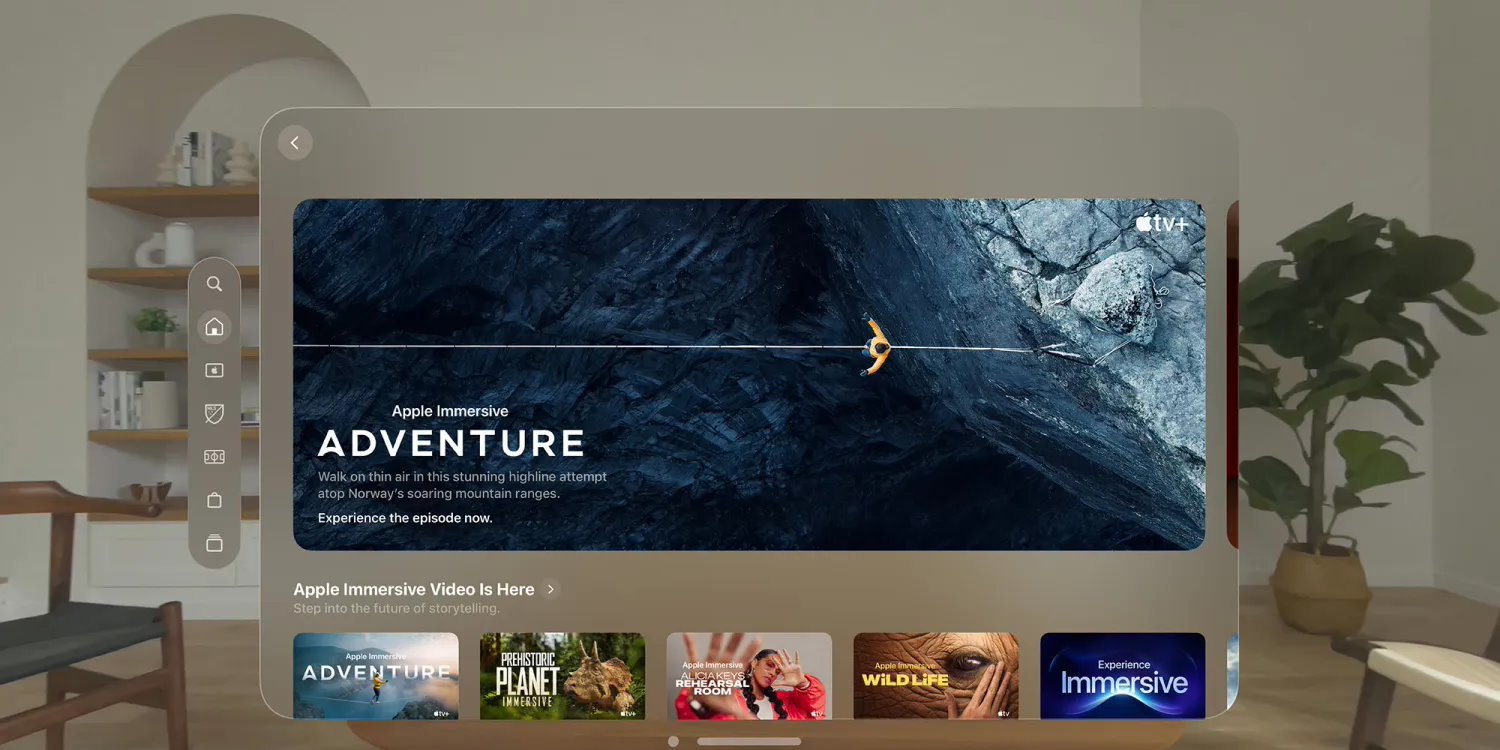 苹果称,Vision Pro 带来全新开创性的娱乐形式 Apple 沉浸式视频(Apple Immersive Video),通过 180 度 3D 8K 视频搭配空间音频,将观众带到故事发生的中心地带,身临其境地感受场景、时刻和故事。上市初期,用户可以在 Apple TV App 上免费欣赏精选的沉浸式电影和剧集,包括艾丽西亚・凯斯排练室、Faith Dickey 高空走钢丝、野生动物、《史前星球沉浸式》。