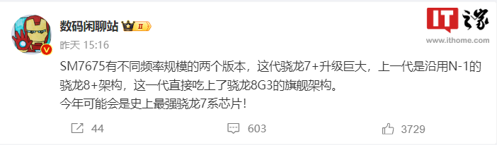 IT之家 1 月 17 日消息,博主 @数码闲聊站近日爆料称,高通即将推出的全新中端处理器 —— 第三代骁龙 7+(或骁龙 7 Plus Gen 3),或将成为 7 系列芯片史上性能最强的存在,因为其将采用与旗舰芯片骁龙 8 Gen 3 相同的核心架构,堪称是“小号骁龙 8 Gen3”。