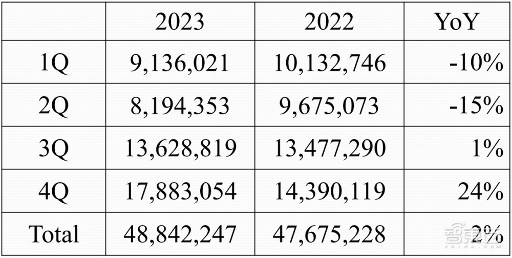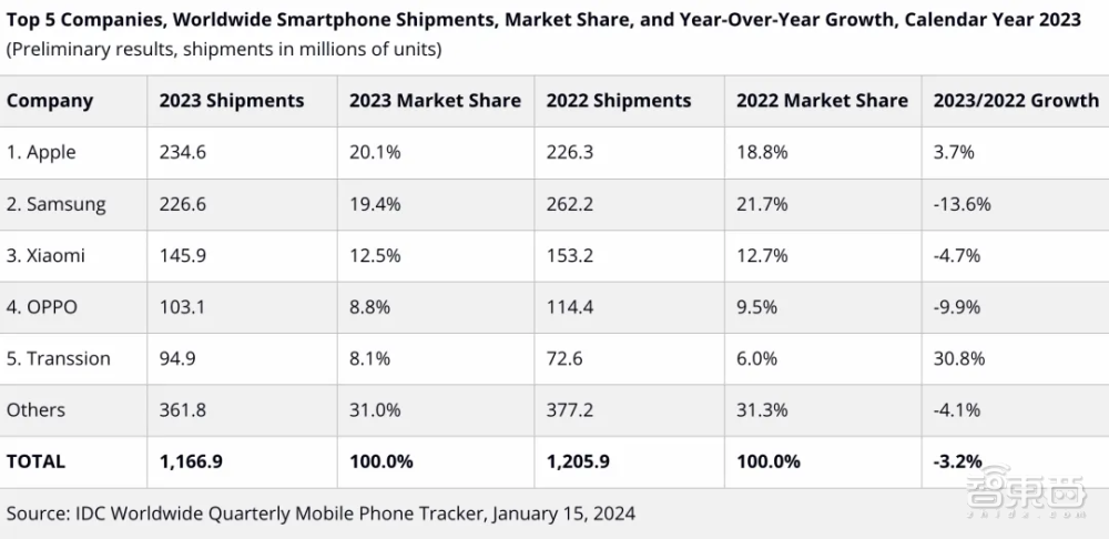2023年全球智能手机出货量及市场份额
