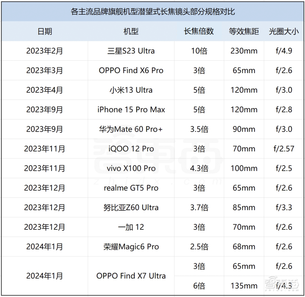 纵观今年OPPO、vivo、荣耀的新旗舰,其搭载的潜望式长焦镜头的光圈基本都已控制在了f/3.0以上,常见光圈为f/2.6。