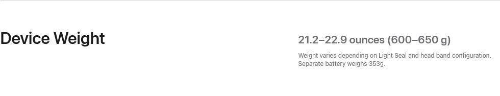 作为参考,这意味着苹果 Vision Pro(不含电池)的重量几乎与 12.9 英寸 iPad Pro(682 克)相当。苹果官方还表示独立电池的重量为 353 克。