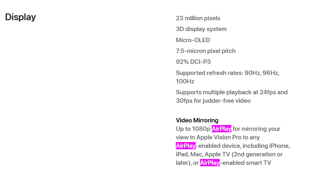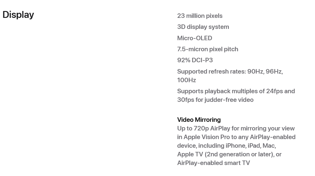 苹果公司在 Vision Pro 头显产品技术规格页面中表示,Vision Pro 头显展示的内容,最高能以 1080P 分辨率镜像到任意兼容“隔空播放”的设备上,从而方便佩戴者向他人展示用户在头显上看到的内容。IT之家附上截图如下: