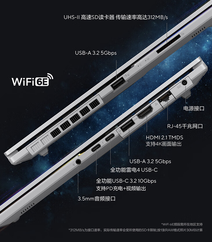 接口方面,这款笔记本配备 1 个雷电 4 接口、1 个 USB-C 3.2 接口、2 个 USB-A 3.2 接口、1 个 HDMI 2.1 接口、1 个 RJ45 接口、1 个 3.5mm 接口、1 个 SD 卡接口。