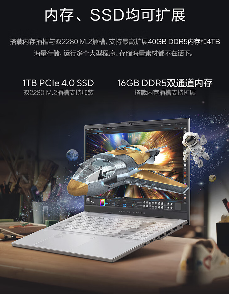 此外,这款笔记本配备华硕冰川 Pro 散热架构(拥有 2 个 12V 风扇、5 热管设计)、ErgoSense 人体工程学背光键盘、触摸板拥有 DialPad 旋钮,使用 75Wh 电池,内存及 SSD 均支持扩展。