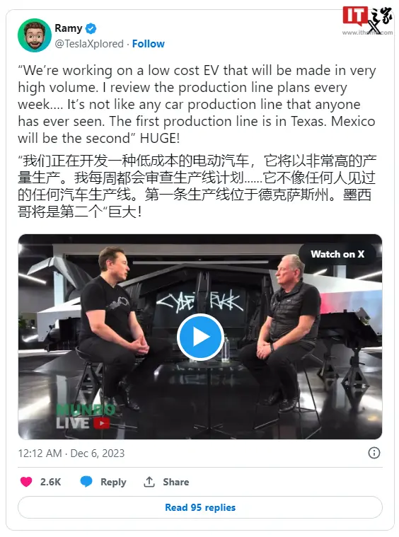 在与门罗交谈时,马斯克最初拒绝透露该项目的具体细节,称这将影响特斯拉未来的收益。但他表示这款低成本车型将涉及一条全新的汽车生产线,大大降低电动汽车的制造成本。马斯克透露:“这是一种远超地球上任何汽车工厂的生产技术水平。” 他还补充说:“第一款产品将在得克萨斯州的超级工厂生产,然后公司计划将生产扩展到墨西哥的第二家工厂。”