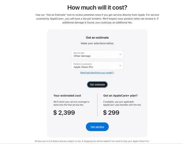 价格卖得贵不说,苹果Vision Pro的维修费用也非常高昂,如果外面的这块玻璃破损,维修费要799美元,约5747元人民币,相当于一台iPhone 15 的价格。