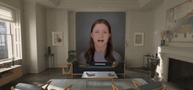 通过这个功能,佩戴者可以和其他人进行视频沟通,Vision Pro 会将佩戴者的动态虚拟形象显示在对方的视频窗口中,虽然看上去人物的仿真效果还不够完美,但观感上已经算比较精致了。