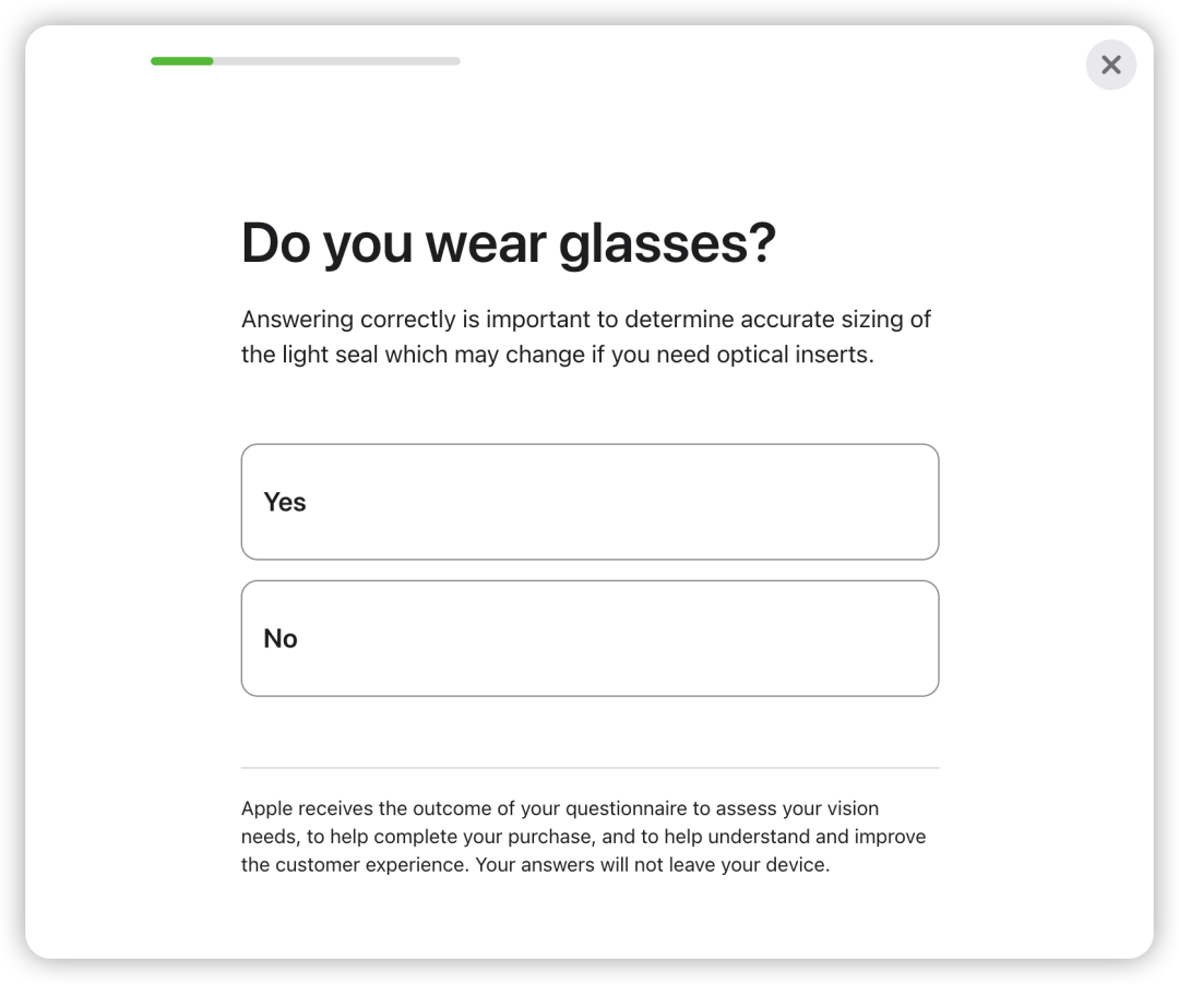 而且和iPhone相比,这次Vision Pro的线上选购流程也有变化,首先需要通过特定的测量流程,引导用户向四周转动头部,测量必要的头围尺寸。