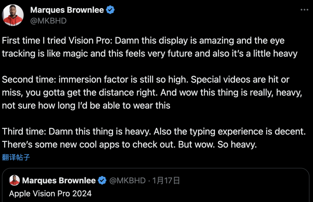 还有知名科技博主@MKBHD 也表示,Vision Pro的重量难以承受,每次在体验某个新功能时,他都感叹了一声“实在太重了”。