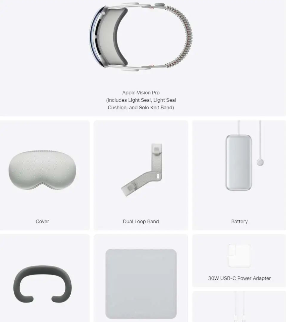 再接下来就是定制Vision Pro的各项配置细节,从官网公布包装盒内容来看,除了头显本体之外,苹果还会附送两款头带、遮光罩、遮光罩眼垫、抛光清洁布、前玻璃保护套、USB-C 充电器套装等。
