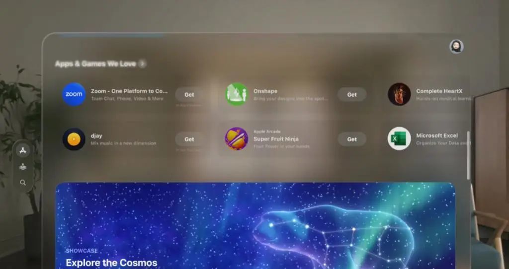在视频最后还飞速展现了一下visionOS 的App Store应用商店,可以看到 Disney+、Zoom、Microsoft Excel / Word 等应用,以及《死亡细胞》等游戏。