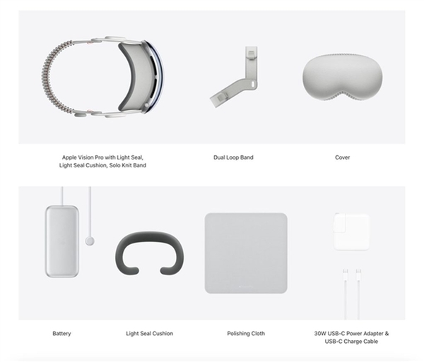 据悉,Vision Pro的包装内除了Vision Pro主机之外,还包括Solo Knit带和Dual Loop带、Light Seal、Light Seal衬垫*2、前玻璃盖、抛光布、电池包、USB-C充电头、USB-C数据线、夹片(额外购买的近视镜片)。