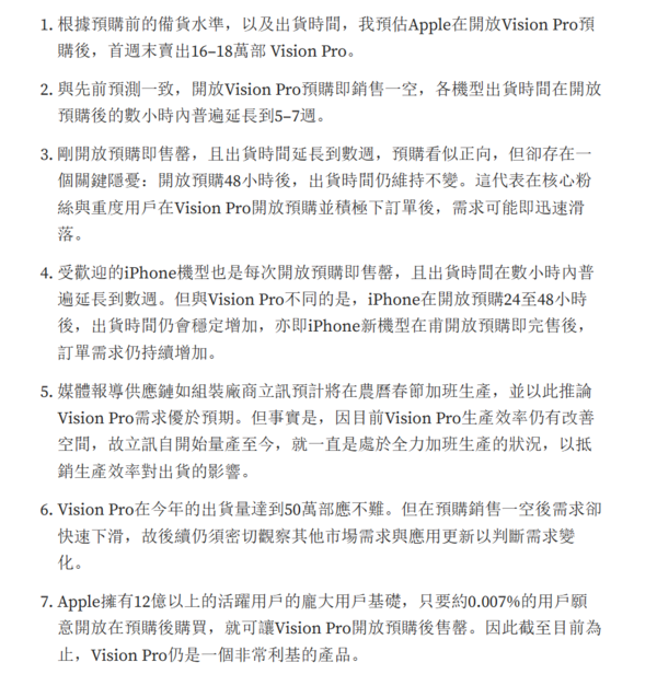 在Medium上的一篇新帖子中,郭明錤表示,这款头显在预购流程开放后不久就售罄,所有型号的发货时间都推迟了五到七周。虽然乍一看,即时售罄和延长的运输时间似乎暗示产品预售是积极的,但郭明錤警告说,在预购开放后48小时,发货日期保持不变,这表明在核心爱好者下订单后,需求可能会迅速减少。