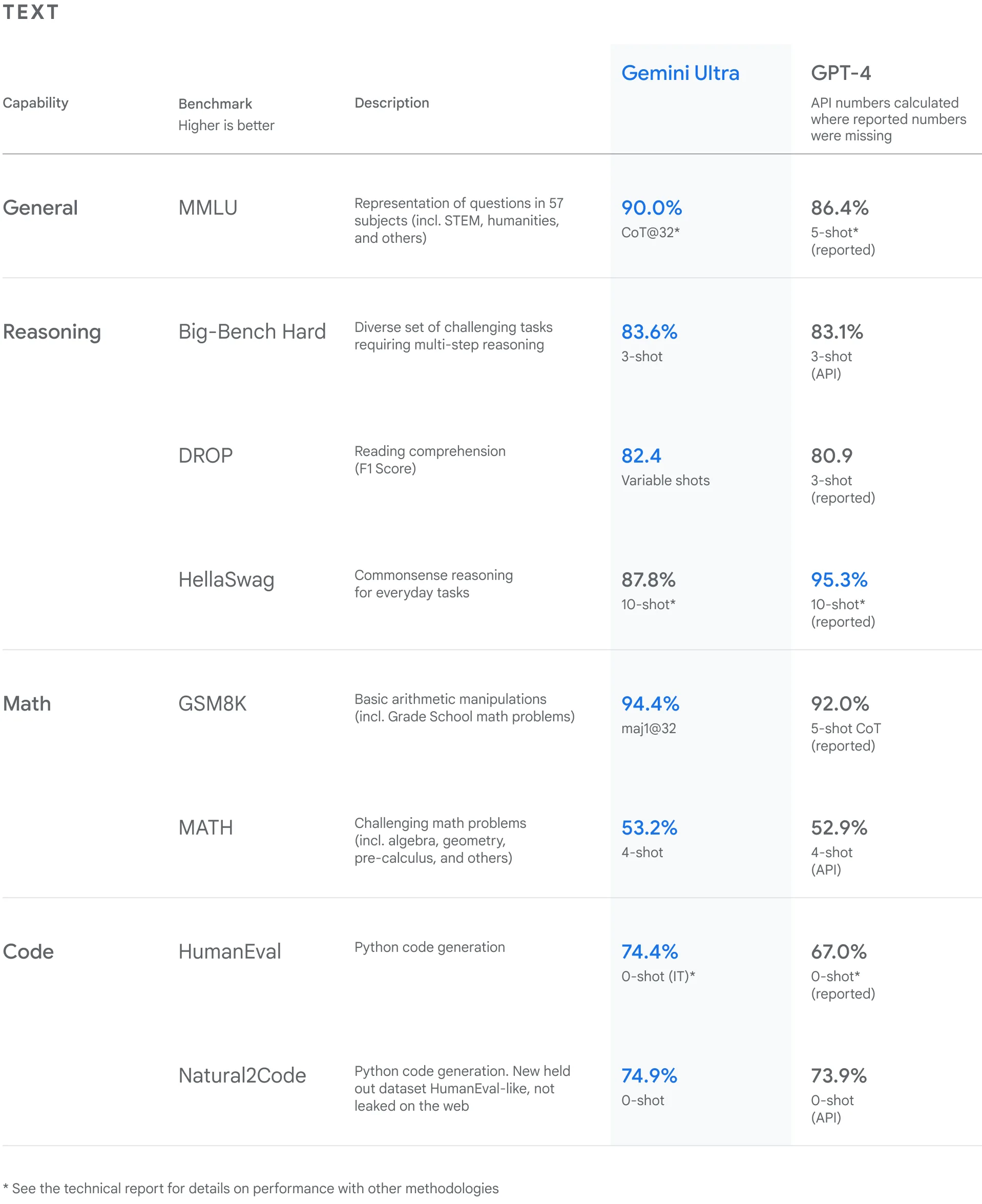 Gemini 在多项基准测试中展现出“最先进的性能”,甚至在大多数测试中完全超越了 OpenAI 的 GPT-4。为了满足不同场景的需求,谷歌发布了三个不同版本的 Gemini,分别为 Gemini Ultra、Gemini Pro 和 Gemini Nano。