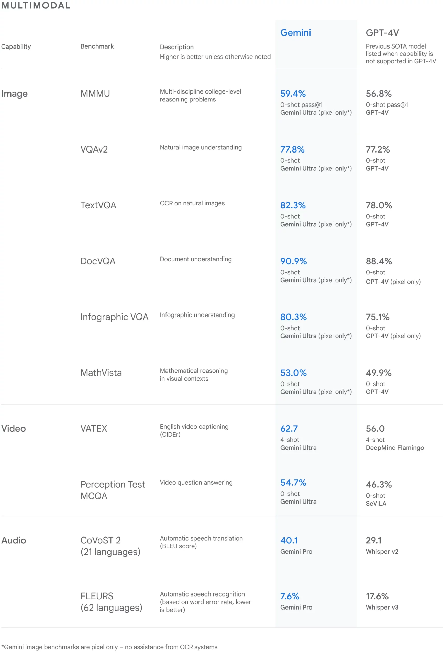 Gemini Ultra 在32个广泛使用的学术基准测试中有30个表现出超越当前时代的“先进结果”。在 MMLU(大规模多任务语言理解)上,其得分达到90.0%,成为首个在该测试中超越人类专家的模型。此外,在新的MMMU基准测试上,Gemini Ultra 表现出领先级性能,达到59.4%。