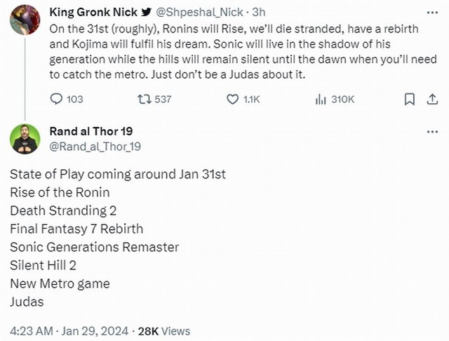 根据尼克·贝克透露的信息显示,这次“State of Play”活动将于2024年1月31日举行,并将为大家带来多款新游戏的消息。其中包括《浪人崛起》、《死亡搁浅2》、《最终幻想7:重生》、《寂静岭2》、《索尼克:世代重制版》以及《地铁》新作和《Judas》。