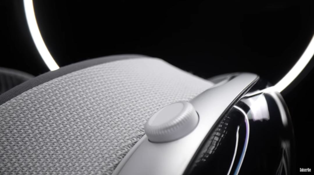在「上头」佩戴前,最大的亮点就是围绕在设备周围的实体部件,不夸张地说,这就是一台 Apple 产品的集合体:头带像 AirPods Max,旋钮是大号的 Apple Watch 表冠。