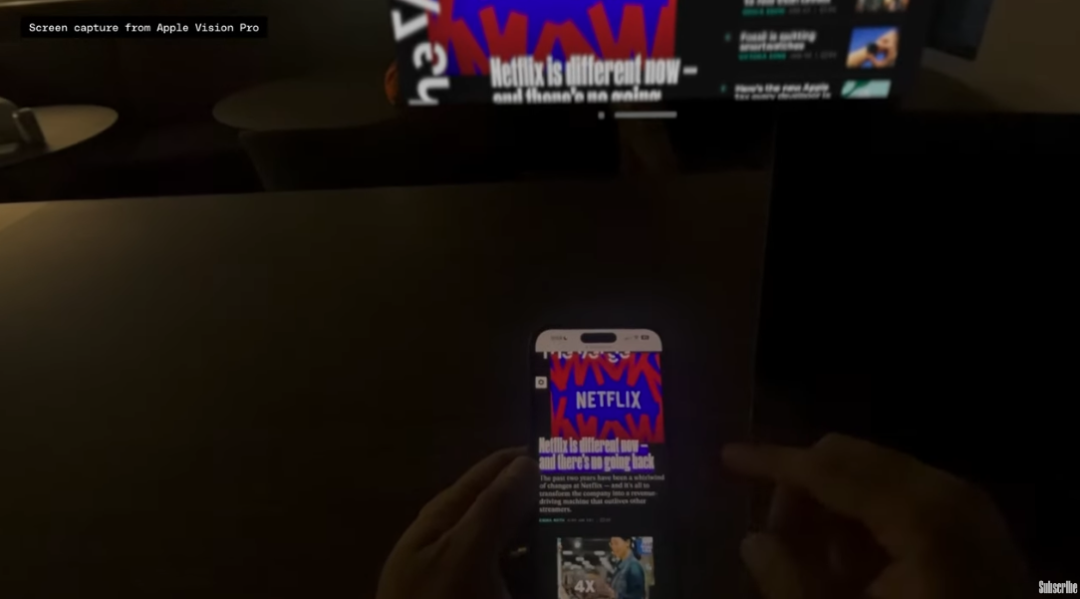 这样的响应速度甚至连一帧的延迟都不到,在看完上一帧视频之前,下一帧的内容已经准备就绪。The Verge 用实测证明了 12 毫秒的真实性,它们带着 Vision Pro 刷手机,都没有出现屏幕失真和跳动显示的情况。