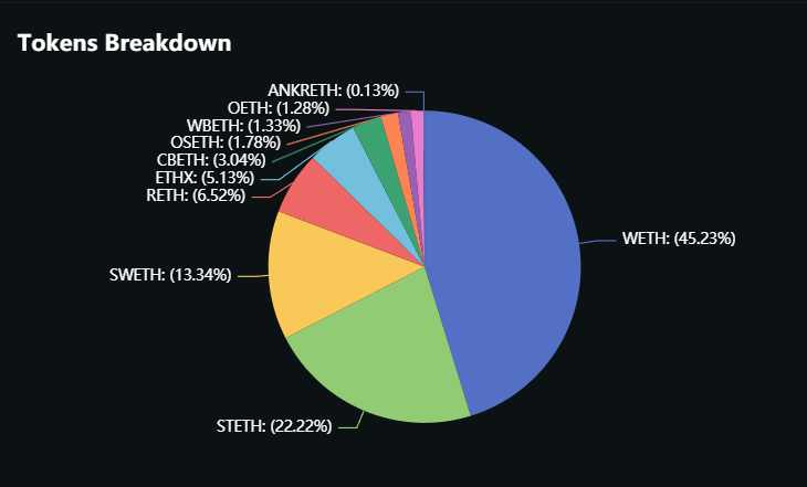 EigenLayer是一个基于以太坊的再质押(Re-staking)协议,为整个以太坊的加密经济体系提供以太坊级别的安全性。截至目前,EigenLayer的总TVL为20.45亿美元,其中最主要的资产包括WETH(45.23%)、STETH(22.22%)和SWETH(13.34%)。
