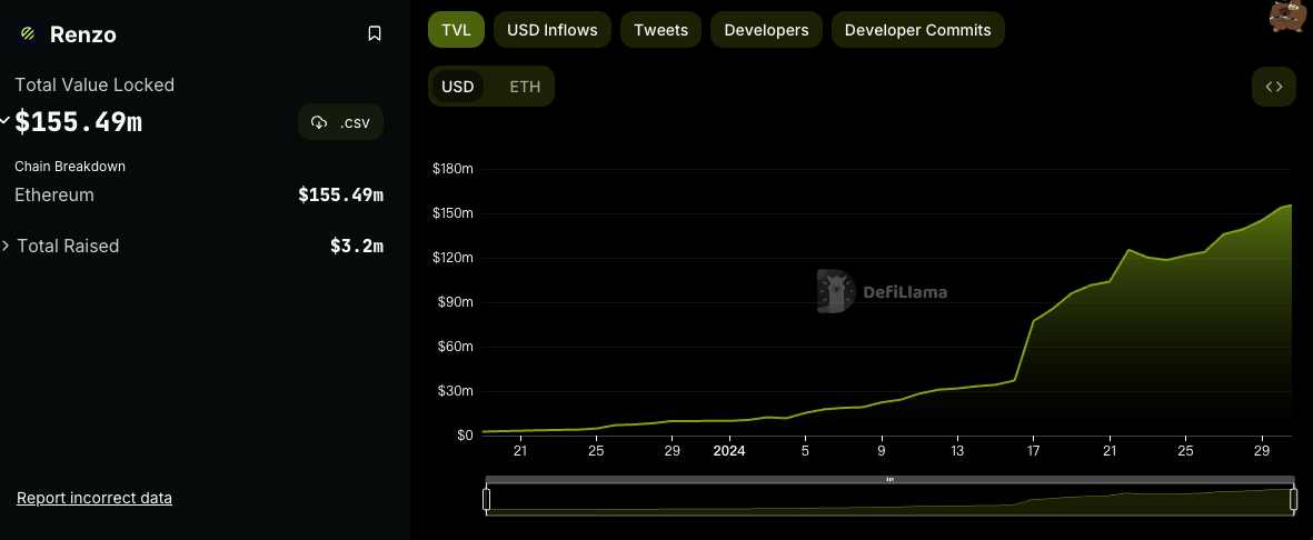 Renzo是一个流动性再质押协议,目前已在EigenLayer的主网上运行。目前,Renzo的TVL为1.55亿美元,主要资产为ezETH。