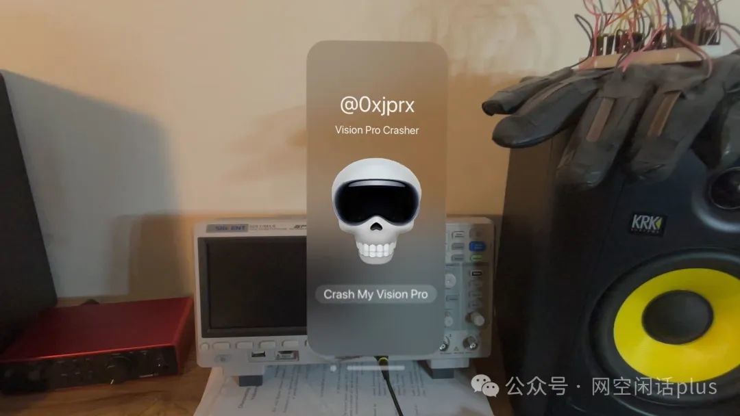 在帖子中,Ravichandran分享了他们为Vision Pro创建的应用程序的图像,该应用程序有一个标有“Crash My Vision Pro”的按钮,上面有一个戴着Vision Pro耳机的骷髅表情符号。点击后,Vision Pro就会崩溃。当它恢复时,它会在完全直通模式下执行此操作,并向用户显示一条消息,告知Vision Pro必须重新启动,并且30秒后它将变暗。