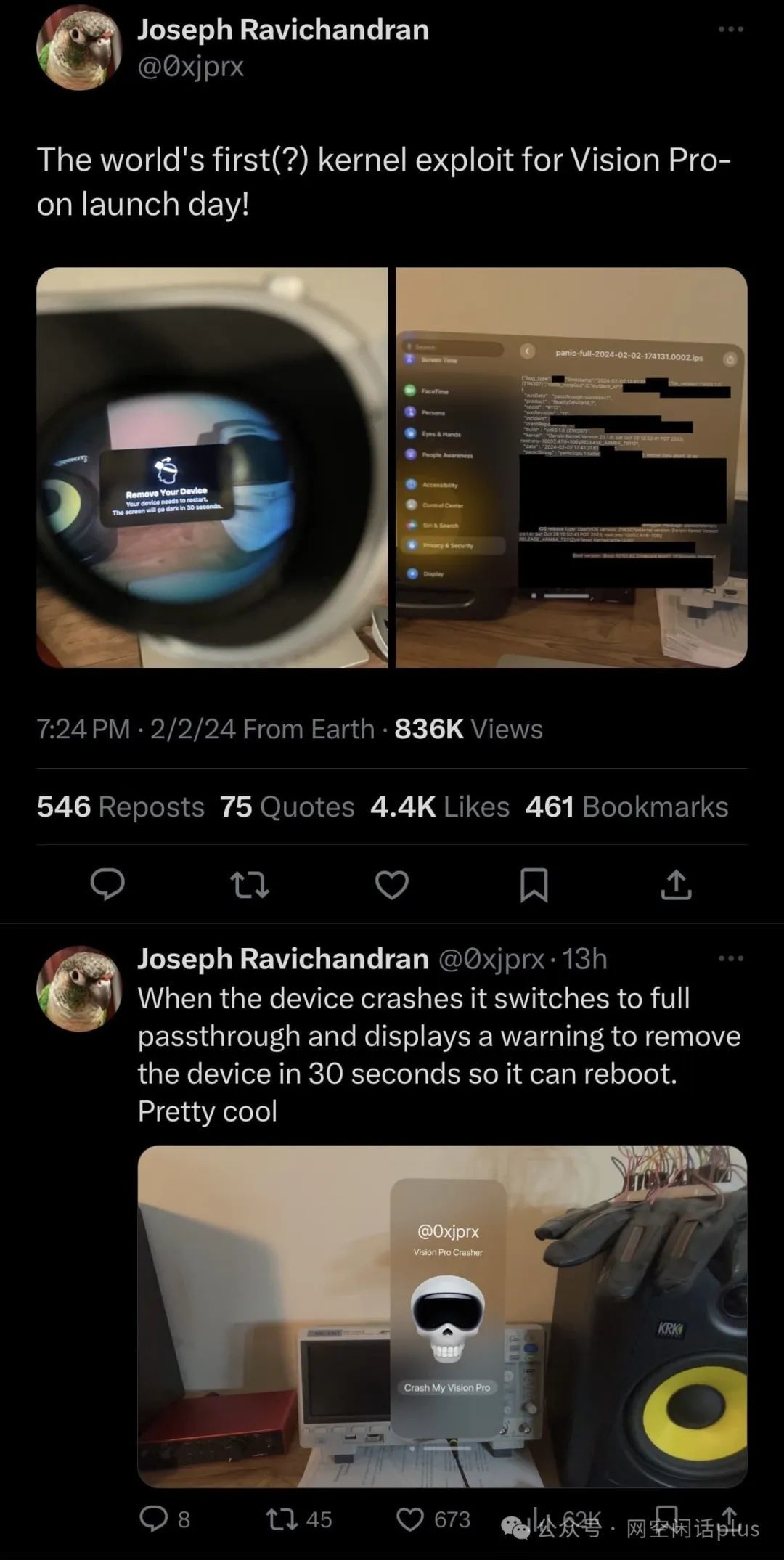 虽然这确实是第一次看到有人在苹果全新Vision Pro上挖掘出的内核漏洞,但它是否真的是世界上第一个还有待观察。另一方面,考虑到它向公众开放的时间很短,人们不会怀疑它。