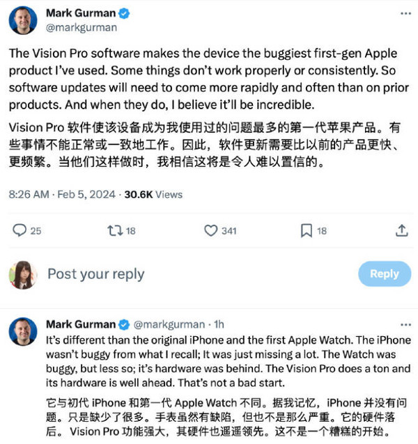 2月5日,手机中国注意到,彭博社的马克·古尔曼发文吐槽,苹果最近发售的Vision Pro BUG实在太多了,是他用过的问题最多的苹果一代产品。